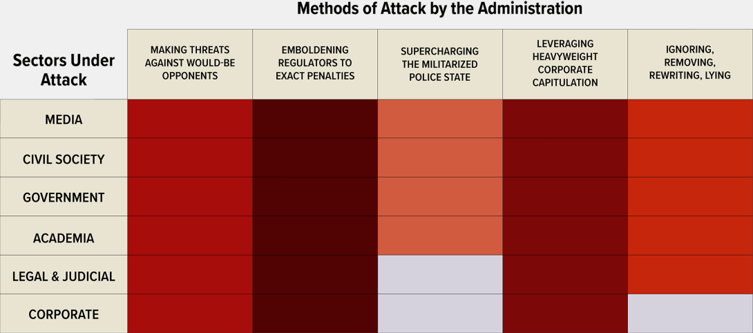 Every sector has faced multiple forms of attack by the federal government, often involving compounding efforts to erode freedom and dissent. This chart lays out the targets of attack and methods the Trump administration has used to chill free speech.